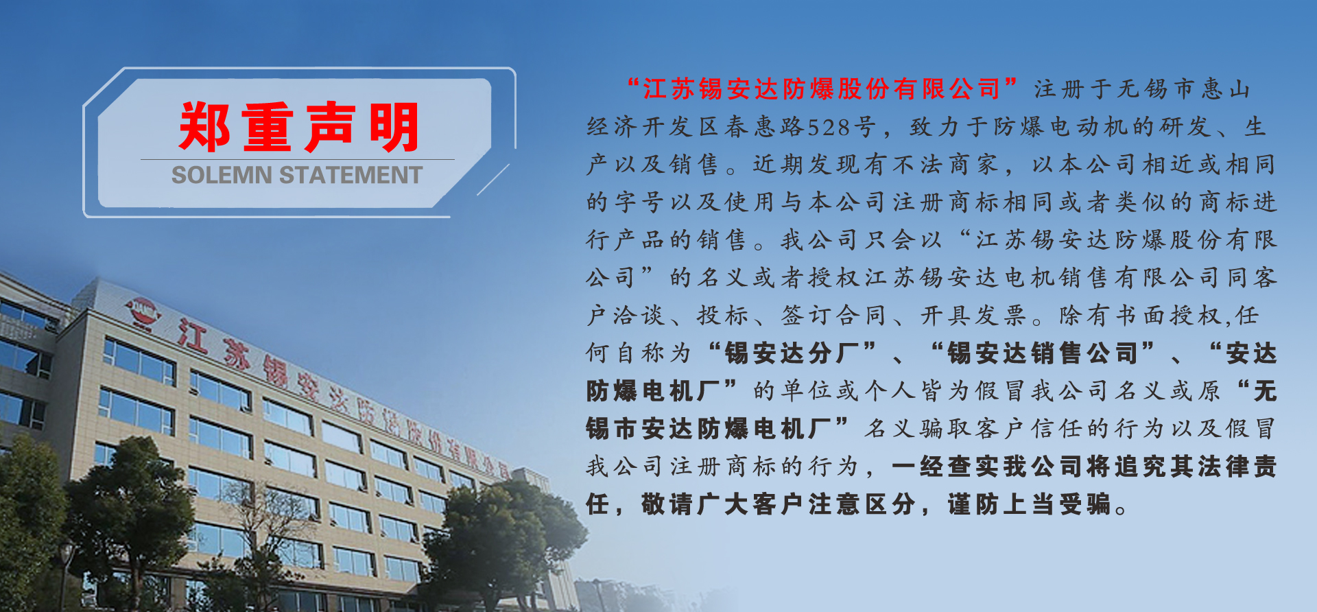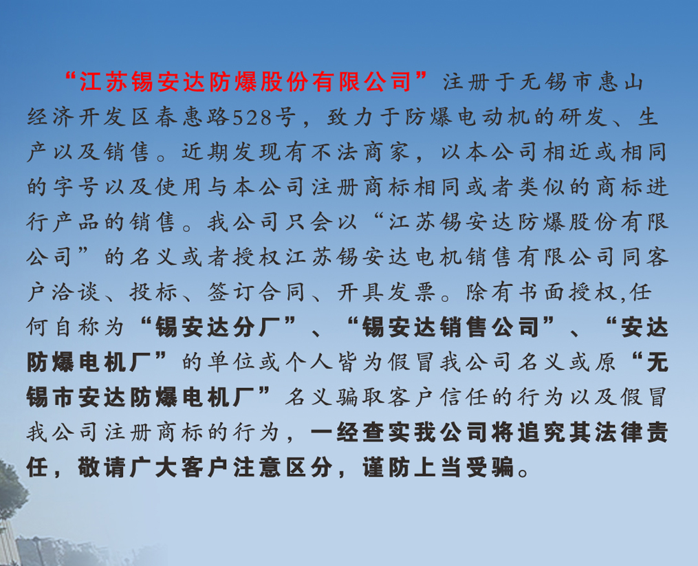 江蘇錫安達防爆股份有限公司由無錫市安達防爆電機廠和江蘇安達防爆機電集團有限公司組建而成,從1986年起開始生產防爆電機,是首批獲得全國工業產品生產許可證的防爆電機企業。